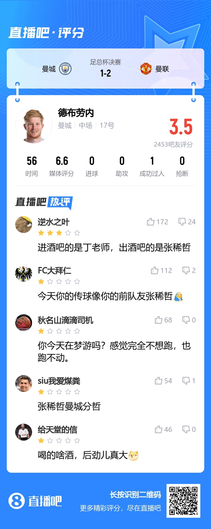 足总杯决赛曼城1-2不敌曼联,德布劳内状态拉胯,吧友调侃其不如张稀哲。