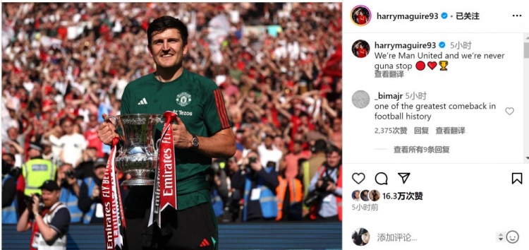 马奎尔因伤缺席此役,赛后他在社交媒体上晒出与奖杯的合照庆祝夺冠,马奎尔写道:“我们是曼联,我们永远不会停下脚步。”