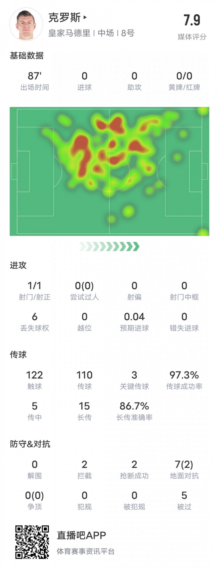 克罗斯主场告别战数据:3关键传球&传球成功率97.3%,评分7.9