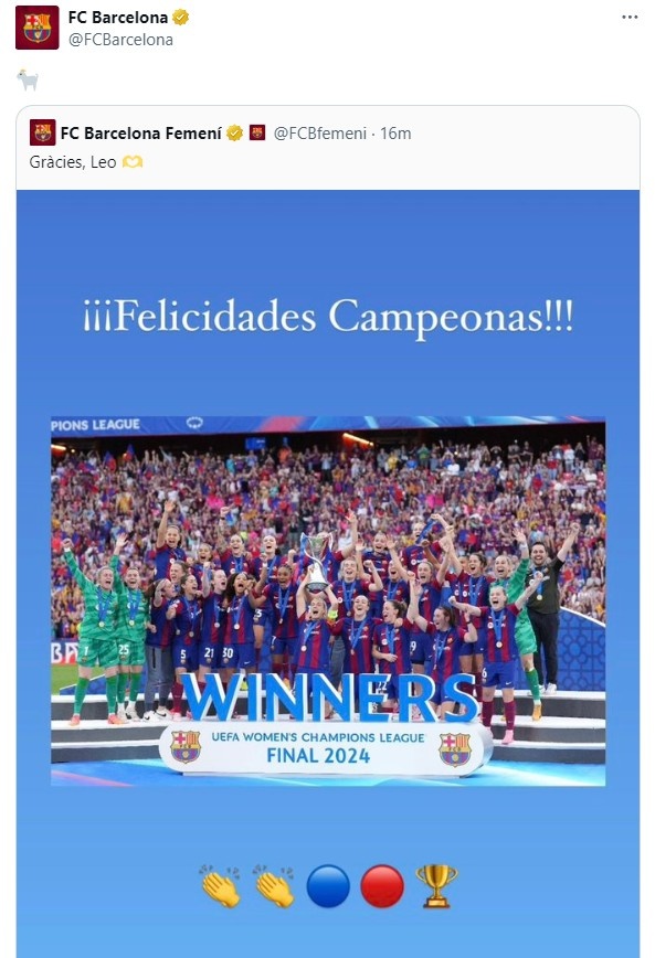 5月26日讯 女足欧冠决赛,巴萨女足2-0击败里昂女足成功卫冕。赛后,梅西晒出巴萨女足捧杯照送上祝贺,巴萨女足官推回复:“谢谢里奥”,巴萨官推转发并附上了emoj“