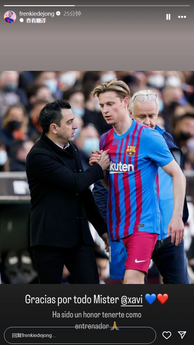 5月26日讯 巴萨官宣哈维将离任,球队中场德容在社交媒体晒图,告别主帅。德容上传了两人合影,并配文写道:“感谢你所做的一切@哈维,被你执教是一种荣幸。”