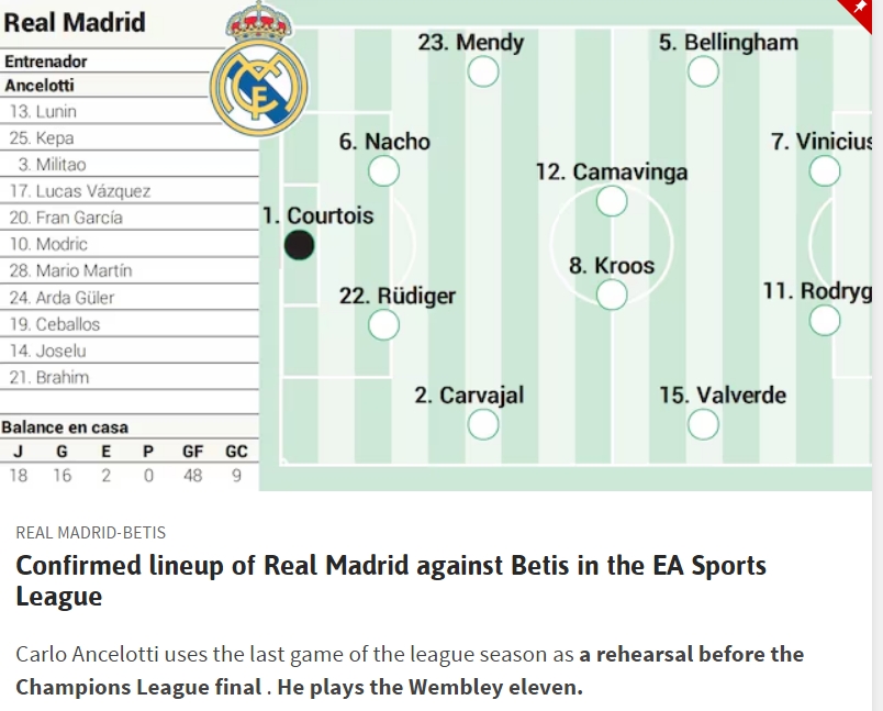 5月26日讯 西甲收官战,皇马主场迎战贝蒂斯。据西班牙媒体《阿斯报》报道,安切洛蒂将此役作为欧冠决赛的练兵预演,他将在欧冠决赛排出与本场相同的首发阵容。
