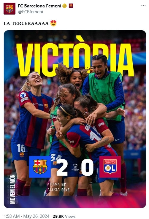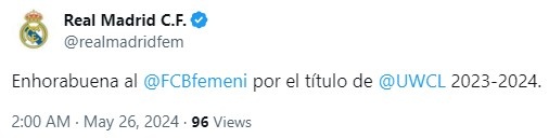 赛后第一时间,皇马女足官推发文祝贺:“恭喜巴萨女足夺得2023-2024赛季女足欧冠冠军。”