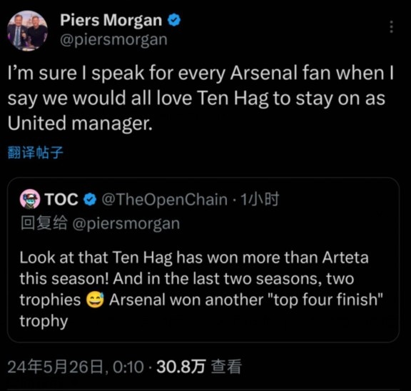 5月26日讯 曼联今天击败曼城夺得足总杯冠军,赛后英国名嘴、阿森纳拥趸皮尔斯-摩根被球迷呛,并做出了回应。有球迷表示:“看看,滕哈赫本赛季赢的冠军比阿森纳多