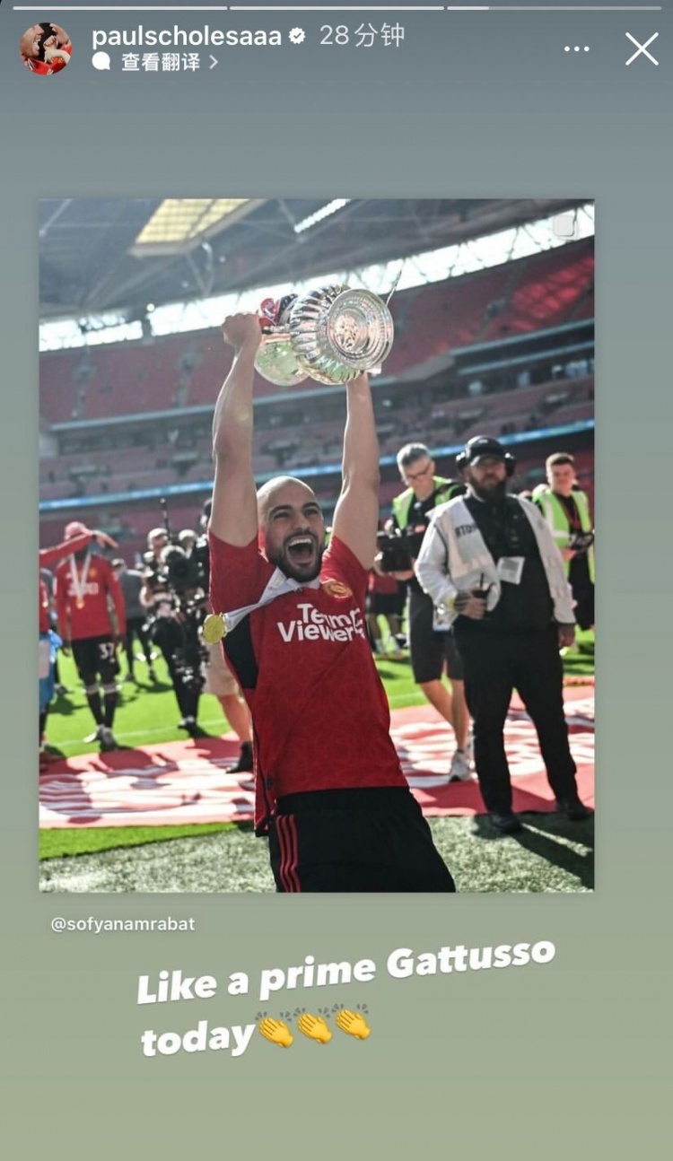 斯科尔斯在社交媒体上转发了阿姆拉巴特捧起奖杯的照片,并写道:“今天就像巅峰的加图索