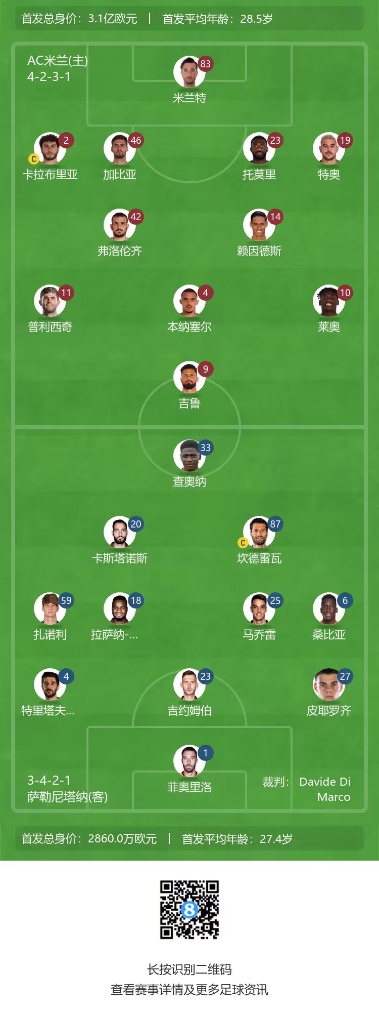 米兰首发:83-米兰特、2-卡拉布里亚、46-加比亚、23-托莫里、19-特奥、42-弗洛伦齐、14-赖因德斯、11-普利西奇、4-本纳塞尔、10-莱奥、9-吉鲁