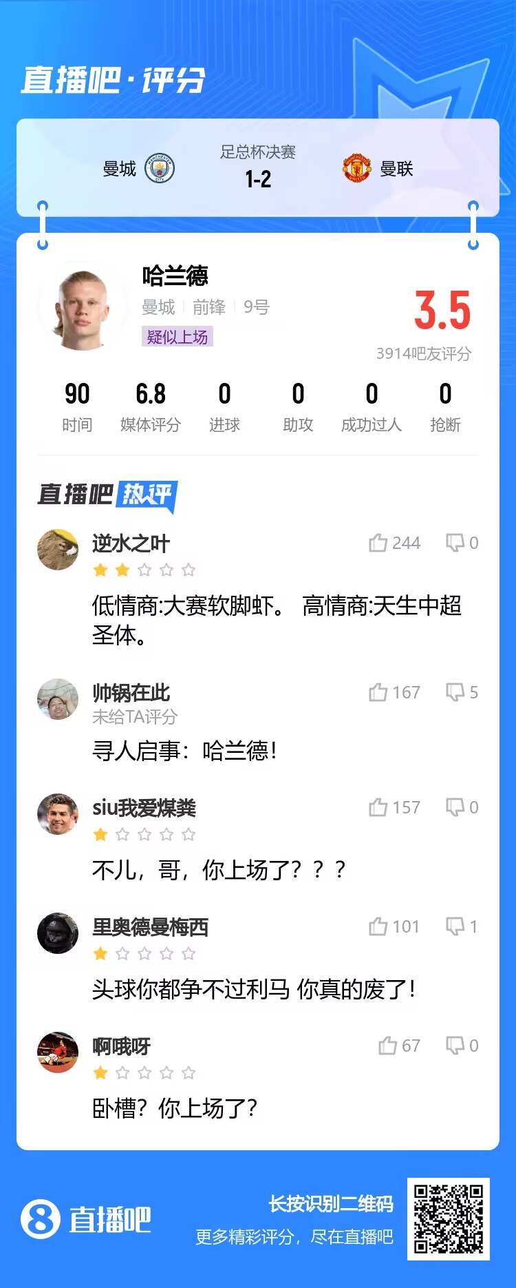 足总杯决赛,曼联2-1战胜曼城,时隔8年再次夺得足总杯冠军。赛后,吧友为哈兰德打出3.5分。