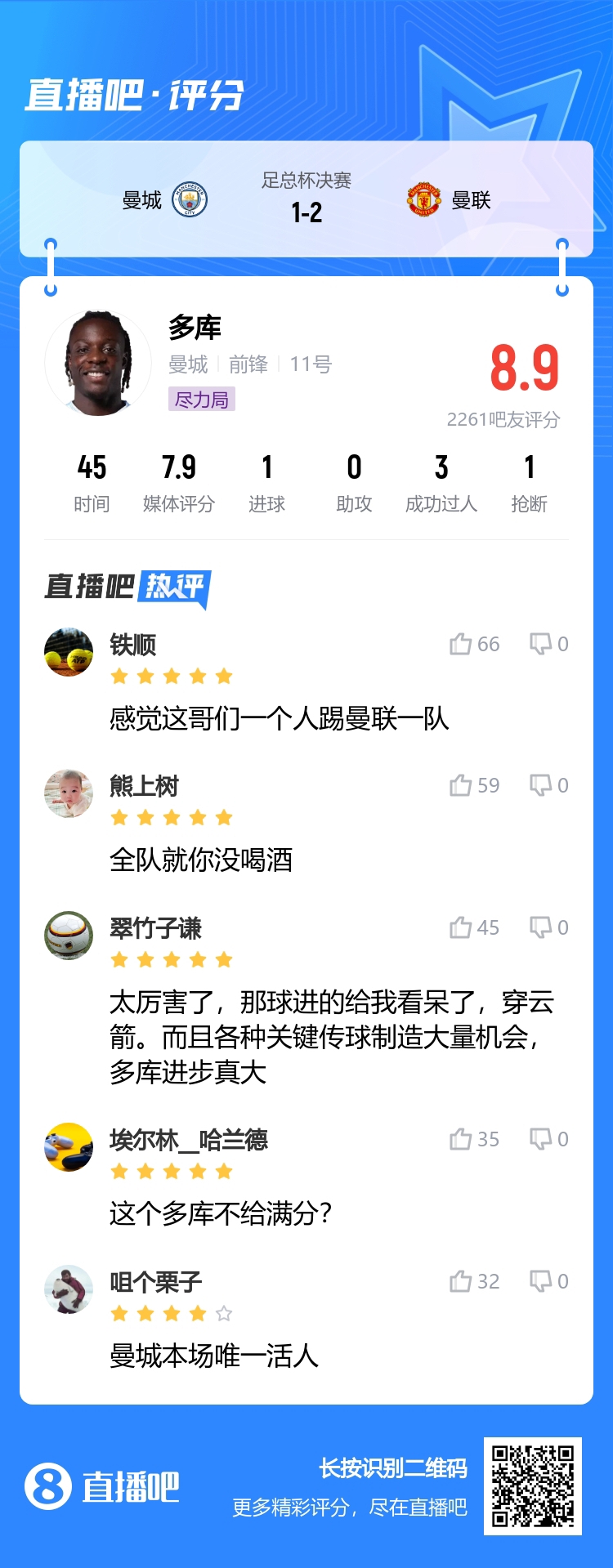 05月26日讯 英格兰足总杯决赛,曼城1-2不敌曼联。曼城边锋多库在半场后替补登场,下半场他屡造威胁,并打入一球,吧友为他打出8.9的高分。