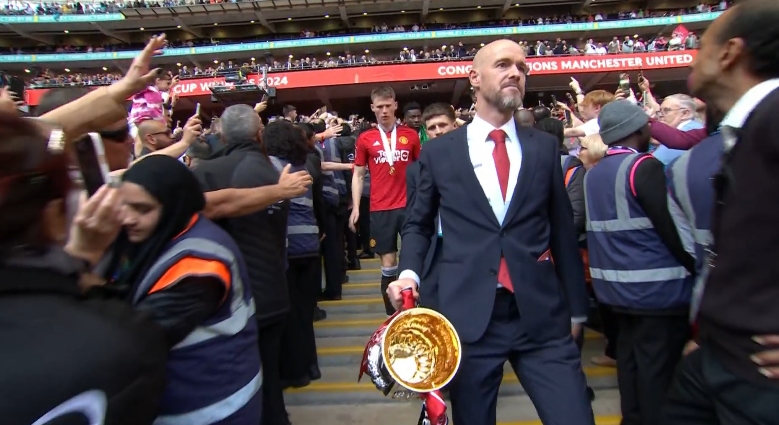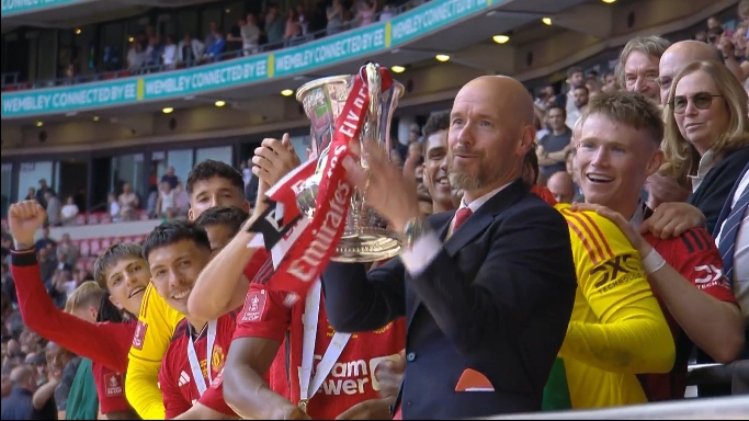 滕帅激情捧杯!滕哈赫颁奖典礼亲吻足总杯,随后高高捧起奖杯