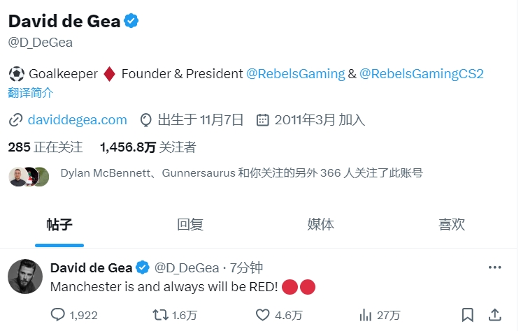 德赫亚写道:“曼彻斯特是且永远将是红色的!”