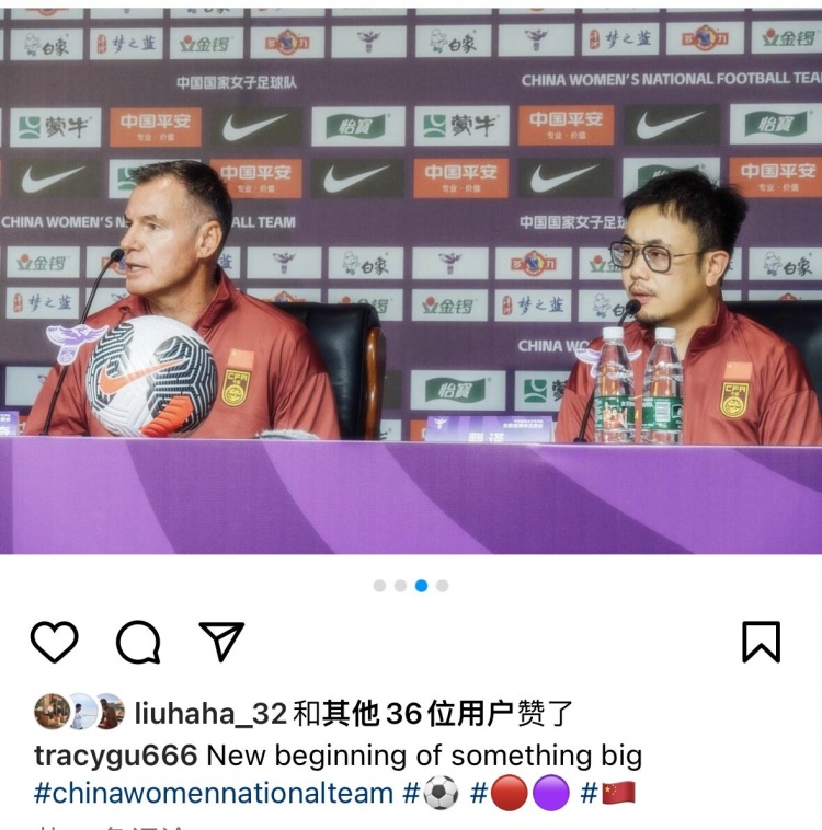 顾江旻在社媒晒出了近期随米利西奇参加媒体见面会的照片,他配文介绍写道:“中国女足大事件的开始。”