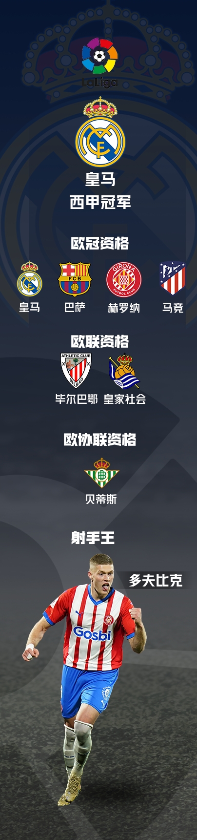 5月27日讯 23/24赛季西甲联赛收官,皇马夺冠,巴萨第二,赫罗纳第三,马竞第四,多夫比克获得西甲金靴,巴埃纳获得助攻王。