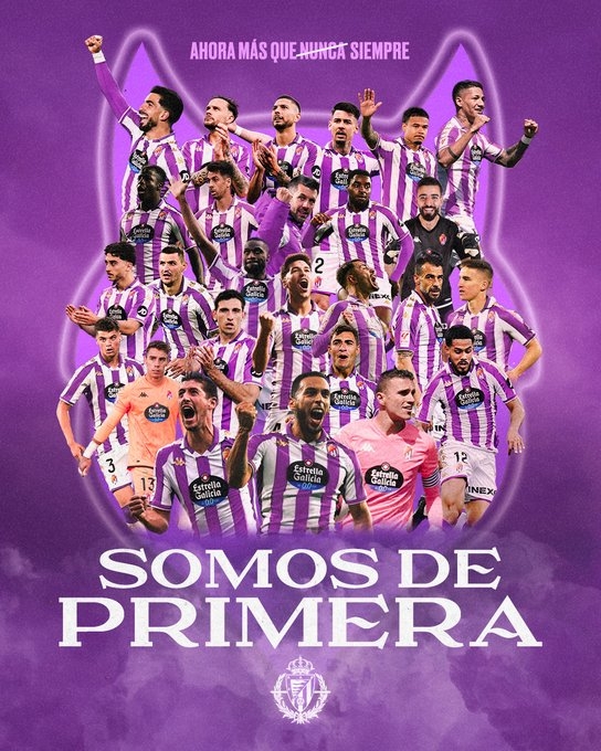 5月27日讯 西乙第41轮战罢,巴拉多利德暂时1分领跑锁定西乙前二确定升级。赛后巴拉多利德官方也晒出海报庆祝球队时隔一年回归西甲。