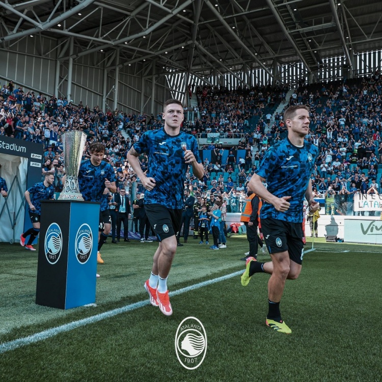 赛前,亚特兰大晒球员热身照,球队刚刚夺得的欧联冠军奖杯就摆放在场边。