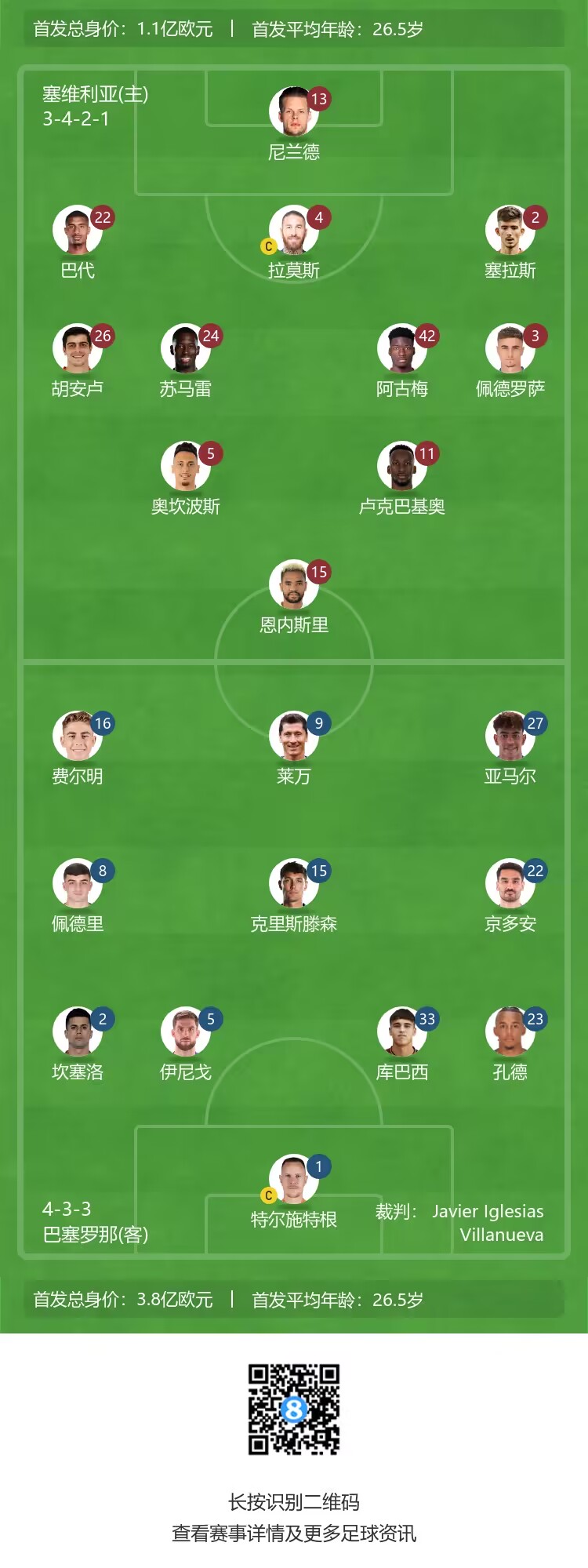 塞维首发:13-尼兰德、26-胡安卢-桑切斯、22-巴代、4-拉莫斯、2-萨拉斯、3-佩德罗萨、24-苏马雷、42-阿戈梅、5-奥坎波斯、11-卢克巴基奥、15-恩内斯里