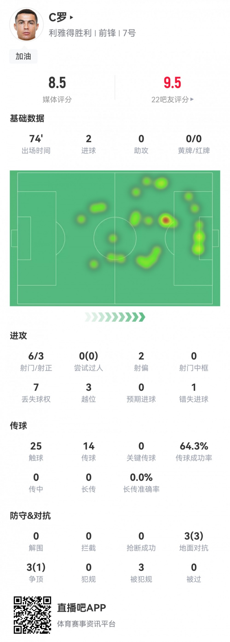 刷新纪录!C罗本场数据:6射3正,2粒进球,3次越位,评分8.5