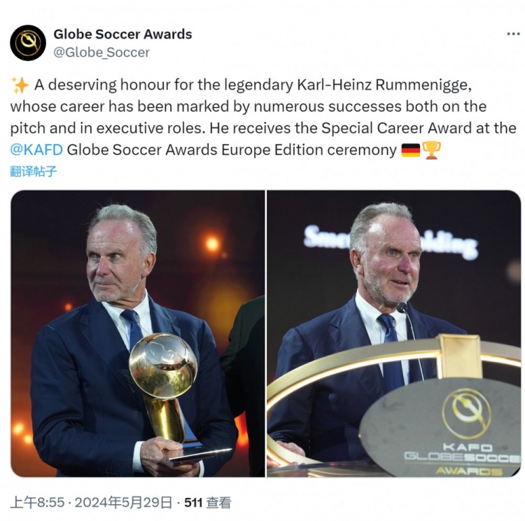 在环球足球欧洲奖颁奖典礼中,德国传奇球星鲁梅尼格获得职业生涯特别成就奖,环球足球奖官方表示,鲁梅尼格职业生涯在球场和管理岗位上都取得了无数成功,获得这一殊荣实至名归,鲁梅尼格在颁奖典礼上领取了奖杯。