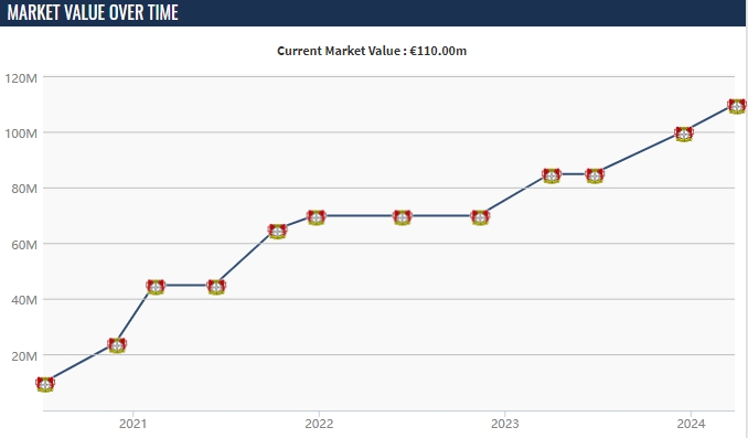 维尔茨17岁第一次身价给出为1000万欧,之后他的身价就一直在稳步提升从未降低。如今21岁的维尔茨身价为1.1亿欧,德转给出的预热数值则是:1.15亿欧,1.2亿欧,1.25亿欧,1.3亿欧。