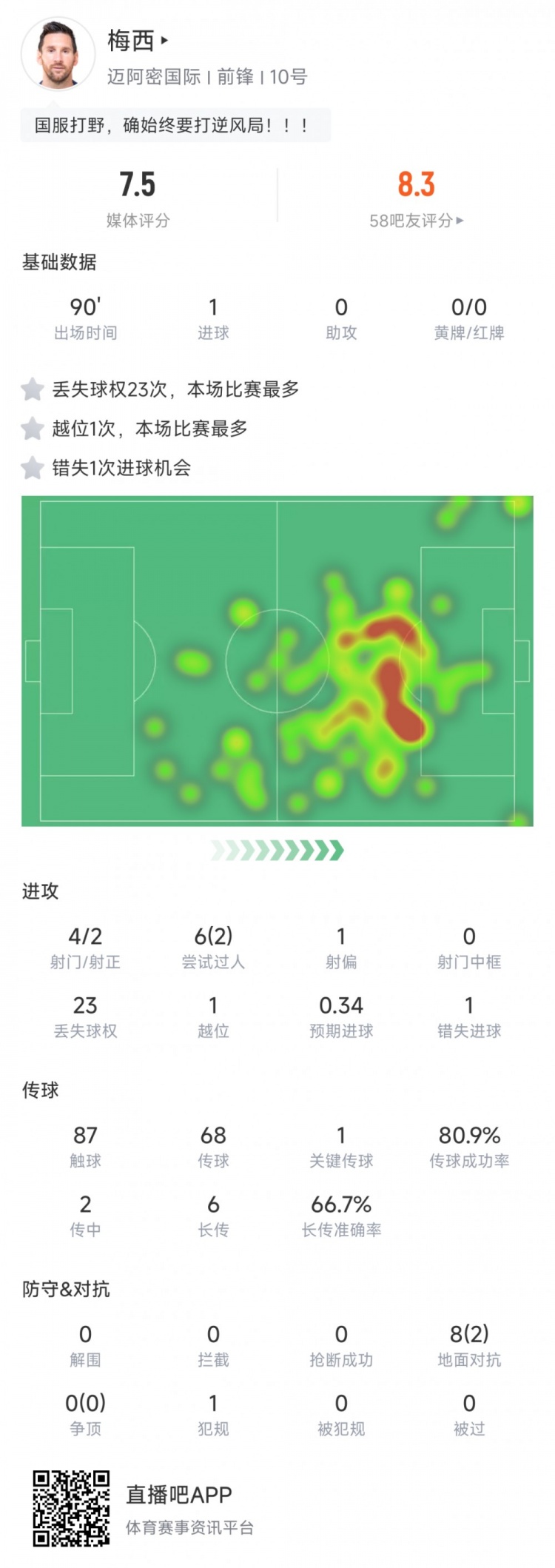 梅西本场数据:首发踢满90分钟打进1球,23次丢失球权