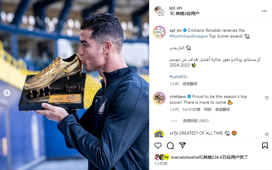 C罗今日在社媒晒出自己亲吻金靴的照片,并配文:“很自豪成为本赛季的最佳射手!未来还会有更多