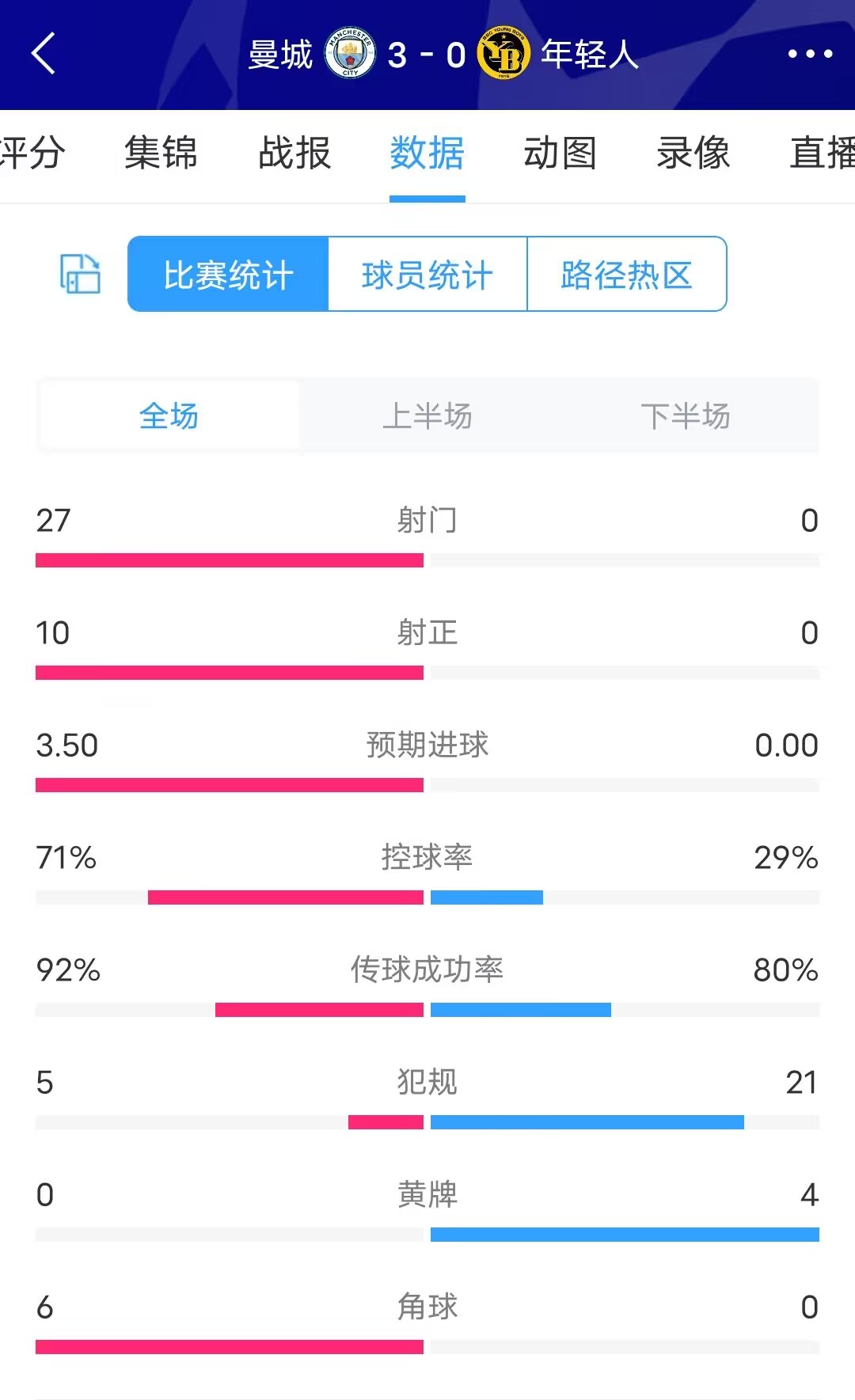 11月8日讯 本轮欧冠,曼城在欧冠中3-0击败伯尔尼年轻人。比赛数据显示,年轻人对曼城全场竟然0射门!0角球!场面全面遭压制!app数据端