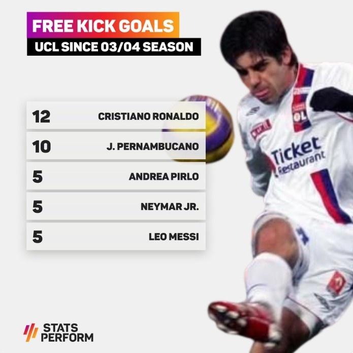 球迷提问:谁在欧冠进任意球最多?OPTA:C罗12次