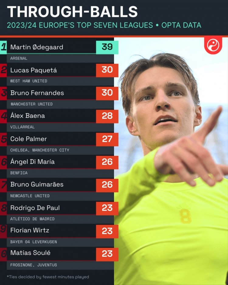 5月31日讯 数据统计显示,厄德高是本赛季欧洲前七联赛送出直塞球最多的球员,他一共送出39次直塞。