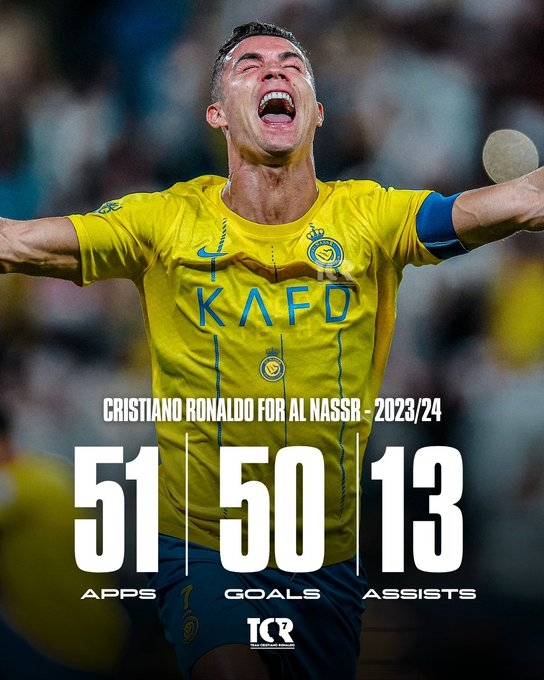 39岁C罗本赛季各赛事出战51场,打进50球助攻13次。本赛季,C罗赛季初6场6球带队夺得阿拉冠冠军,但联赛、亚冠、沙超杯和沙王冠均无缘冠军。