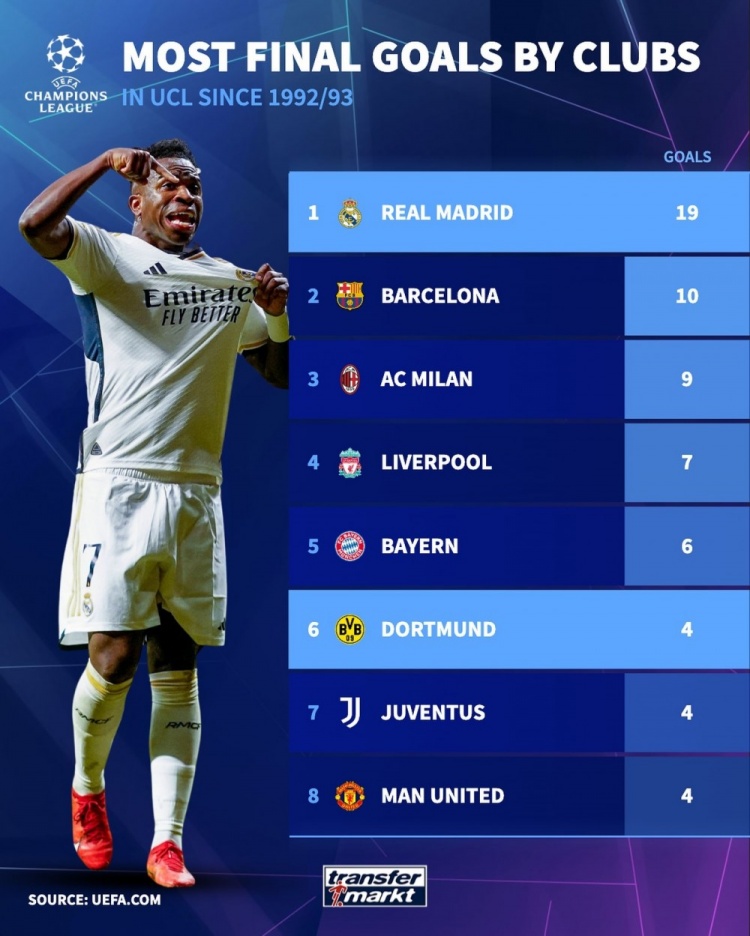 德国转会市场统计了欧冠改制后(1992-1993赛季)球队在决赛中的进球数量,并列出榜单,皇马以19球居首,多特打进4球排名并列第六位。