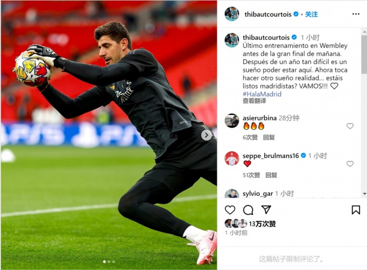 库尔图瓦在社交媒体上写道:“明天决赛前在温布利的最后一次训练,在经历了如此艰难的一年之后,能够来到这里真是梦想成真。现在是实现另一个梦想的时候了......皇马球迷你们准备好了吗?加油!”