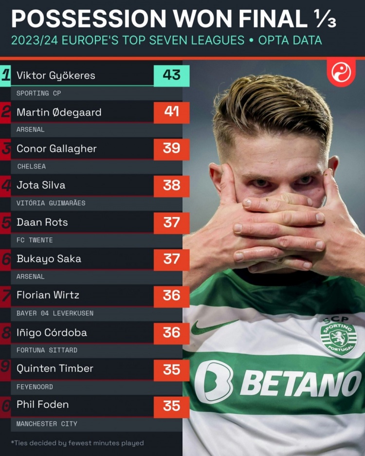 6月1日讯 Squawka统计了本赛季欧洲前七联赛球员在进攻三区夺得球权的次数,并列出榜单,葡萄牙体育前锋约克雷斯以43次居首,厄德高、加拉格尔排名二三位。