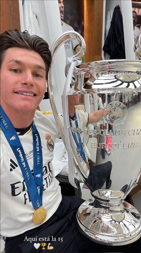 6月2日讯 欧冠决赛皇马2-0战胜了多特夺得冠军,赛后加西亚在ins上晒照表达自己的喜悦之情。其中一张照片加西亚怀抱奖杯,写道:“第15座冠军奖杯!”