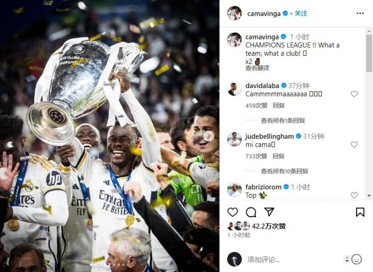 卡马文加写道:“欧冠联赛!!多么棒的球队,多么棒的俱乐部啊!2个欧冠冠军。”