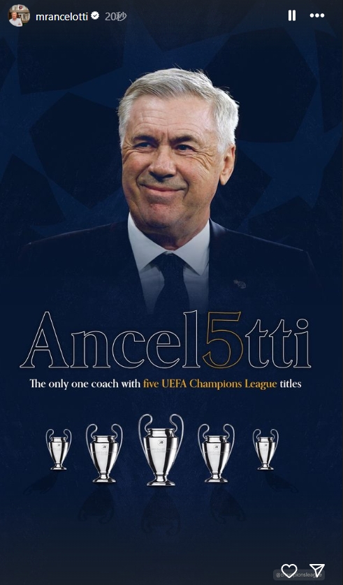 安切洛蒂是历史上唯一一位赢得5座欧冠冠军的教练,在对多特赛后,安帅晒出了纪念海报。