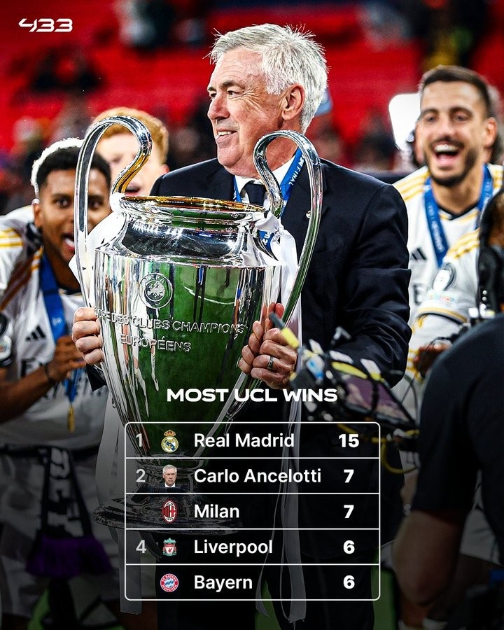 今天凌晨,安切洛蒂带领皇马击败多特蒙德,夺得欧冠冠军。现在,安帅已经赢得7座欧冠,仅次于15座欧冠的皇家马德里,与老东家AC米兰持平,多过6次夺冠的利物浦和拜仁慕尼黑。