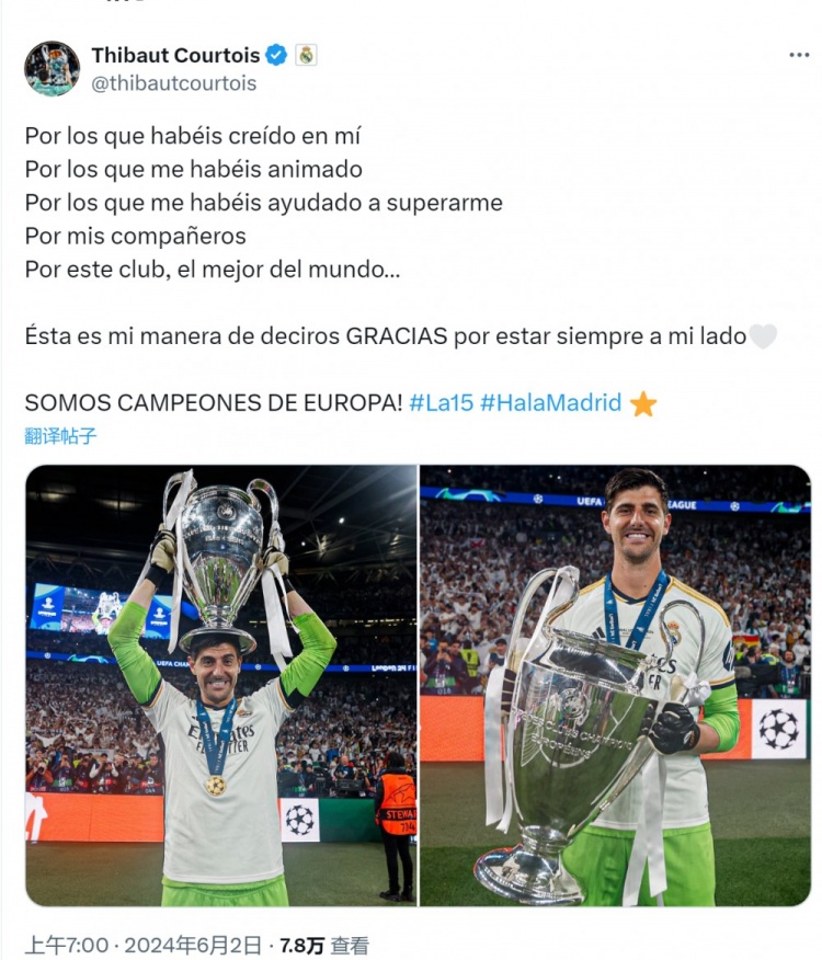 6月2日讯 在北京时间今天凌晨进行的欧冠决赛中,库尔图瓦完成零封,帮助皇马2-0击败多特,赢得队史第15座欧冠奖杯。赛后库尔图瓦在社交媒体上晒出与奖杯的合照,