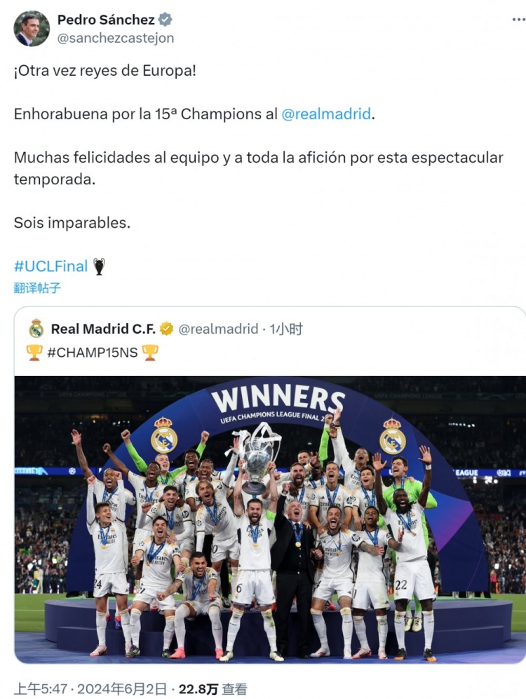 6月2日讯 在北京时间今天凌晨进行的欧冠决赛中,皇马2-0击败多特,赢得队史第15座欧冠奖杯。西班牙首相佩德罗-桑切斯在社交媒体上对皇马表示祝贺,他写道:“再次