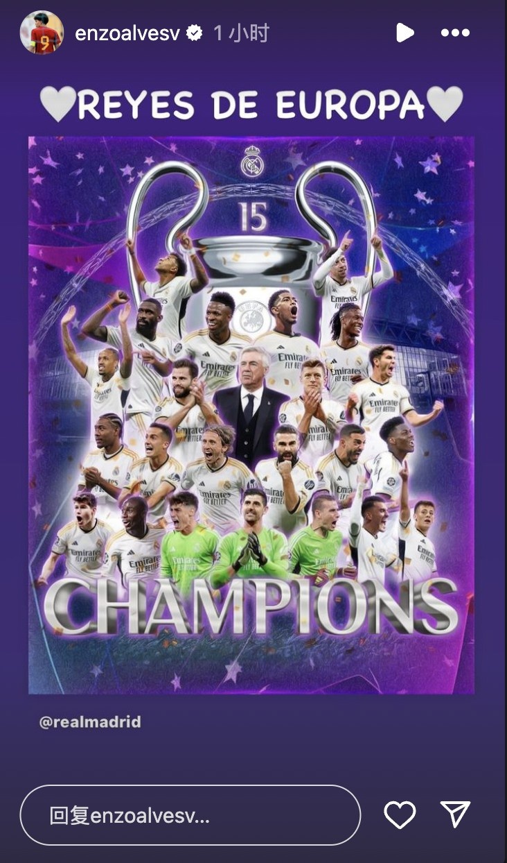 6月2日讯 皇马夺得队史第15座欧冠,皇马梯队小将——马塞洛的儿子恩佐发文。