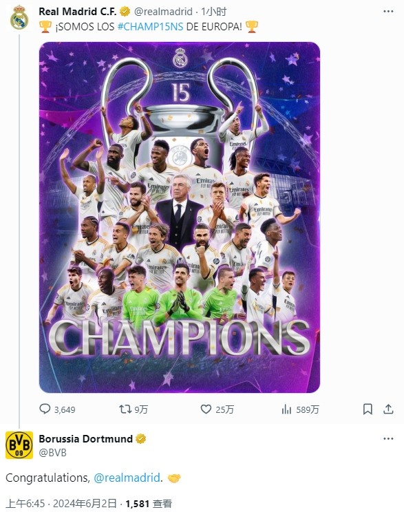 6月2日讯 欧冠决赛,多特蒙德0-2不敌皇家马德里,无缘欧冠冠军。比赛结束后,多特官方向皇马送上祝贺。多特官推先是在皇马官方海报下评论:“祝贺,@皇马。