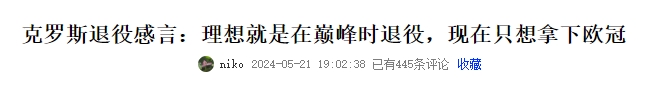 06月02日讯 5月21日,克罗斯宣布离开皇马,并在欧洲杯后退役。克罗斯当时表示:“我的理想一直是在巅峰状态下结束我的职业生涯。从现在起,我只有一个念头:拿下欧