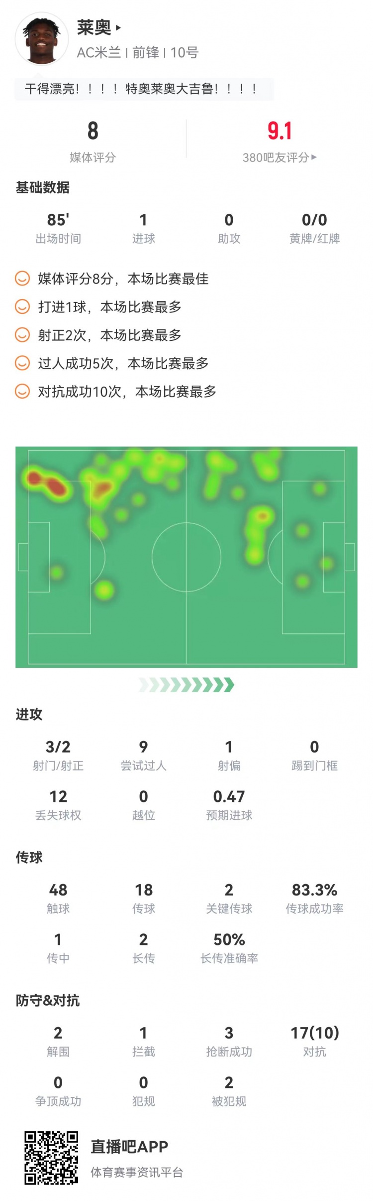 11月8日讯 欧冠小组赛,米兰主场2-1击败巴黎。此役莱奥发挥出色打进一球,赛后莱奥也当选全场最佳球员。莱奥全场数据↓(南川源)