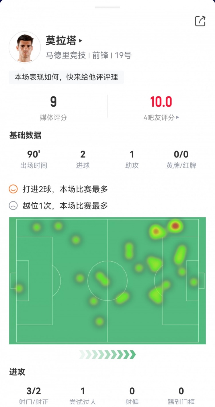 莫拉塔本场数据:2射1传,传球成功率95%,获评9分
