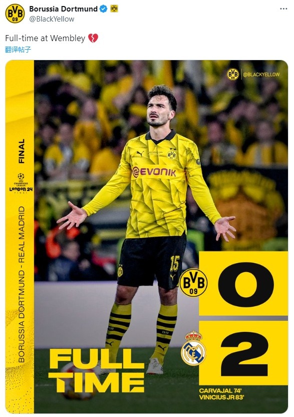 6月2日讯 欧冠决赛,多特蒙德0-2不敌皇家马德里。赛后,多特官推发文:“温布利全场结束
