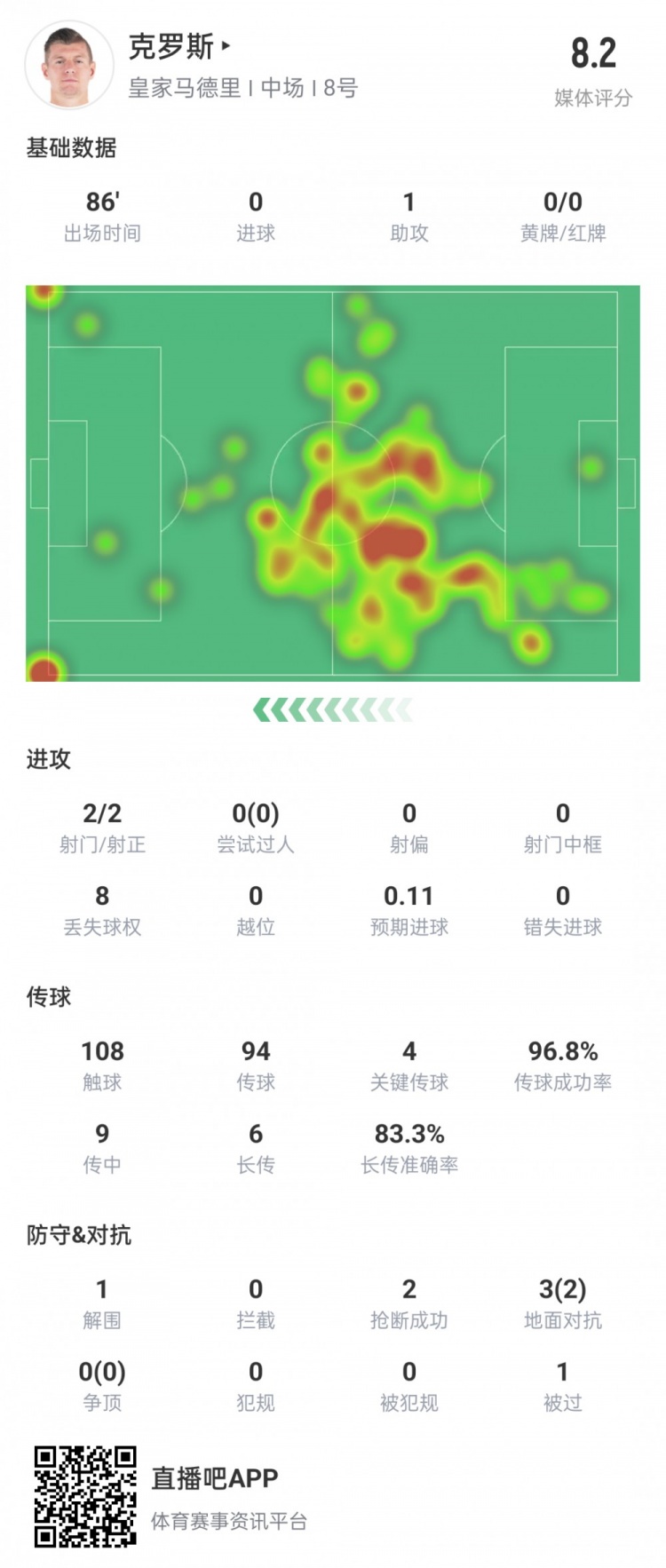 6月2日讯 欧冠决赛,多特蒙德对阵皇家马德里,克罗斯第85分钟被换下,结束皇马生涯最后一场比赛。克罗斯本场数据如下。1次助攻108次触球94次传球,91次成功,成功率