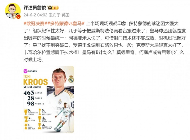 6月2日讯 欧冠决赛半场结束,皇马和多特战成0-0平!詹俊在个人社媒发表看法。詹俊:上半场现场观战印象: 多特蒙德的球迷团太强大了!组织纪律性太好,几乎等于把威