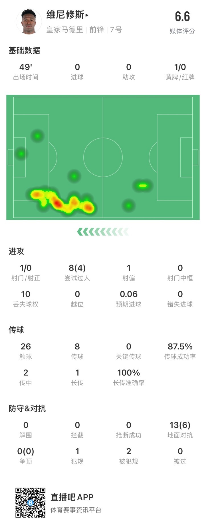 维尼修斯半场数据:评分6.6,1次射门0射正&10次丢失球权