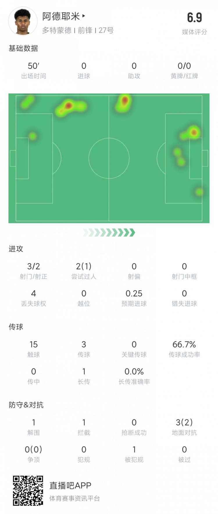 半场数据方面,阿德耶米3脚射门2脚射正,2次过人1次成功,错失单刀机会,预期进球0.25。评分暂时6.9分。