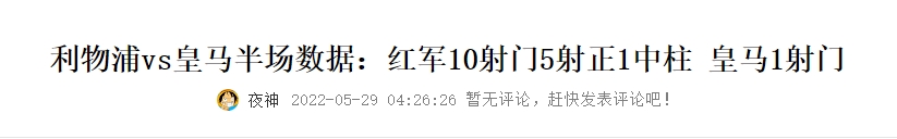 何其相似!2022欧冠决赛半场数据:利物浦10射5正1中柱 皇马仅1射
