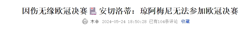 5月24日,安切洛蒂在采访中曾经确认琼阿梅尼将因伤缺席欧冠决赛,而阿拉巴上一次出场已经是去年12月的事情了。