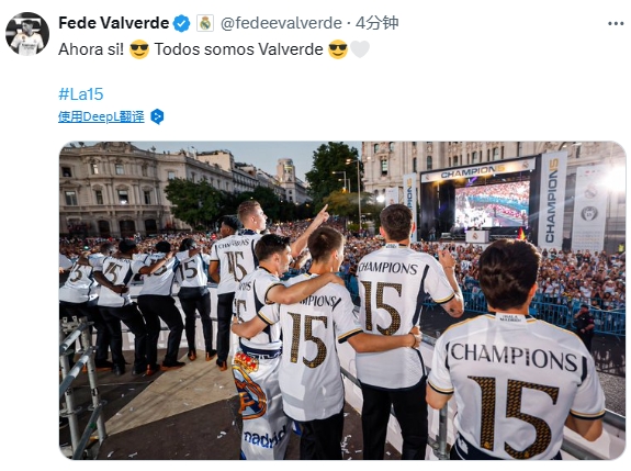 06月03日讯 皇马夺得欧冠冠军,今日举行游行庆祝。巴尔韦德晒照并写道:现在我们都是巴尔韦德(15冠,巴尔韦德现在球衣号码15号)